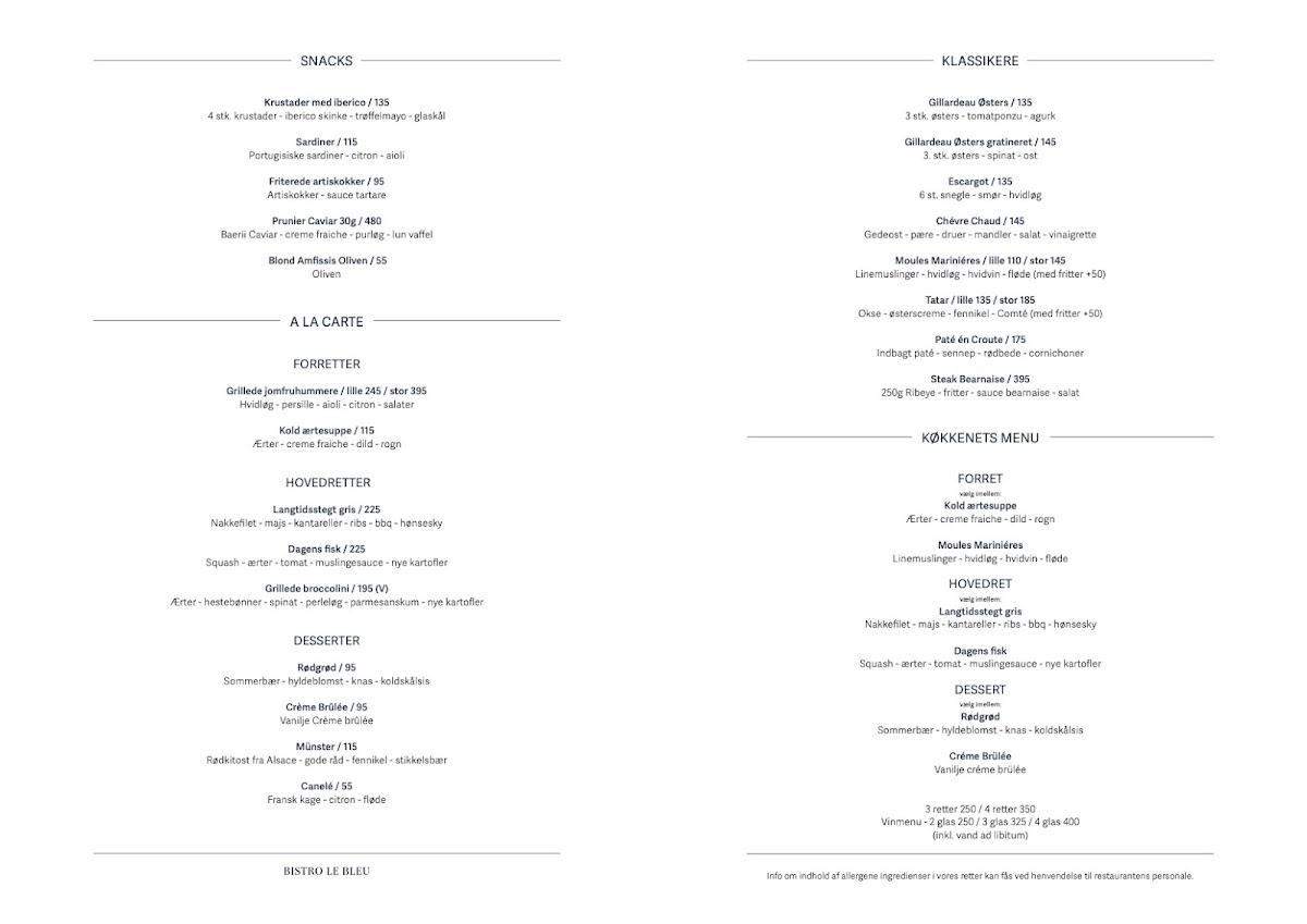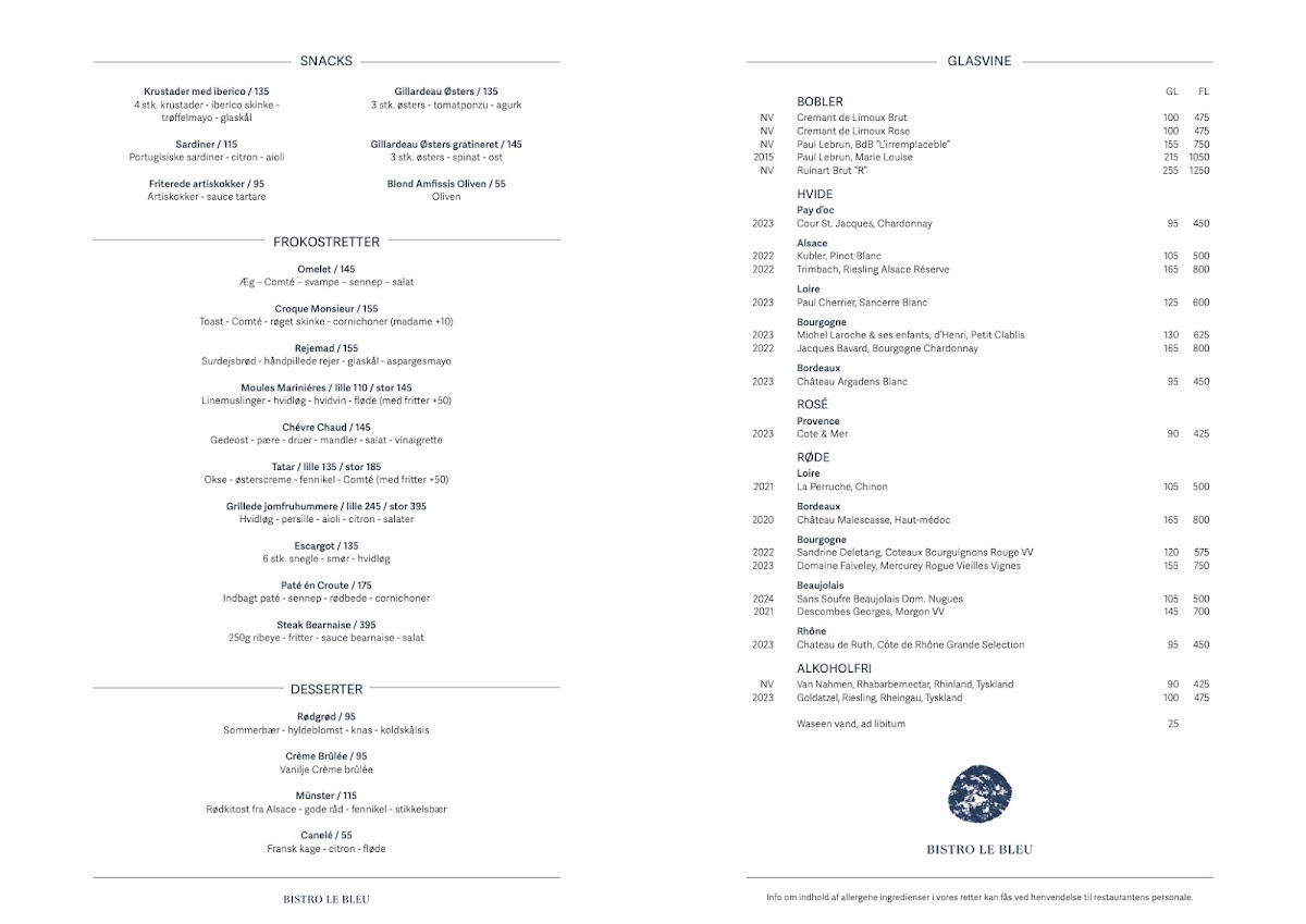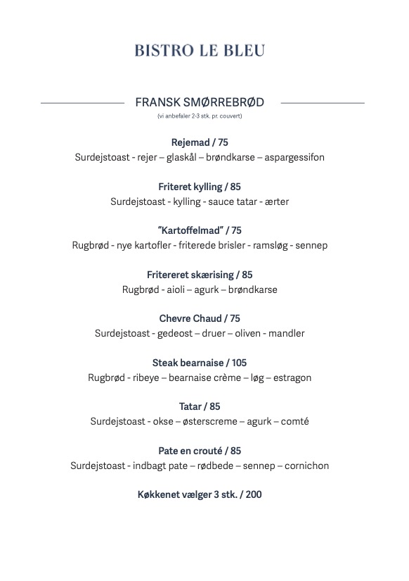 Bistro Le Bleu offers a refined yet approachable dining experience in the heart of Aarhus. The lunch menu, or Frokost Menu Sommer 2025, features classic Danish smørrebrød, with options like roast beef and herring paired with traditional accompaniments, perfect for a light but satisfying midday meal. For dinner, the Aften Menu Sommer 2025 presents a selection of seasonal dishes designed to highlight fresh ingredients. The Aften kort offers both hearty and delicate options, catering to various tastes. The simplicity and quality of the menu ensure that each dish, whether at lunch or dinner, embodies the essence of Danish culinary traditions. The atmosphere and thoughtfully crafted plates make it a memorable destination for any meal of the day.